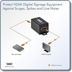Tripp Lite’s B110-SP-HDMI In-Line Surge Protector fits right into your HDMI digital signage installation. Simply connect it between your source and display using HDMI cables and protect your source and display against damage caused by lightning and electrostratic discharge (ESD). To protect both source and display, two surge protectors are required.