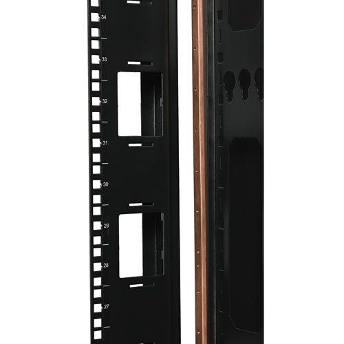 Protect rackmount equipment by providing individual grounding with Tripp Lite's SRGROUND Copper Grounding Bar rack accessory. The SRGROUND installs easily in racks up to 42U and provides grounding for equipment at every U. The pre-drilled holes allow for ground wire jumpers to run from the SRGROUND to the each individual piece of equipment. This individual grounding system protects equipment against surges and circuit overloads by allowing a direct path to ground rather than going through surrounding equipment. The SRGROUND can be installed with toolless mounting buttons or the included screws.