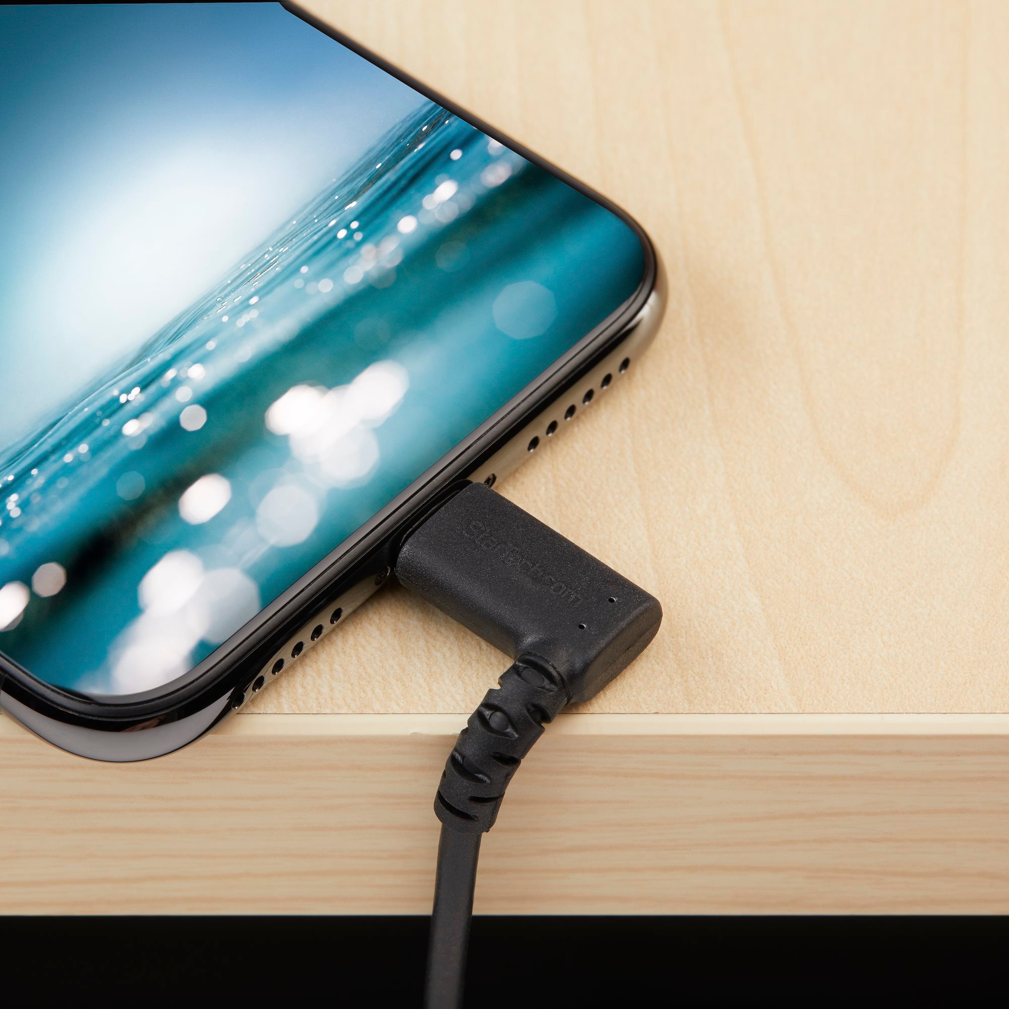 This angled Lightning to USB cable withstands the demands of charging and syncing your mobile devices. The angled Lightning connector gives you easy access to your mobile device, even while charging. And, and the longer cable is ideal for overcoming distance restrictions.