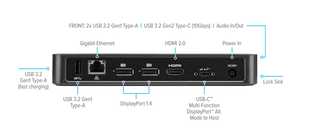 Enjoy crisp, clear native video while supporting a connection up to three monitors. With two DisplayPort™ 1.4 ports and one HDMI 2.0 port, you’re able to support three monitors (1920x1080 p60), two monitors (2560x1440 p60) or one monitor (3840x2160 p60) and various lower resolutions. Plus connect all your favorite accessories with a combination of USB-A (4 USB 3.2 Gen1 ports, 1 fast-charging) and USB-C (1x 3.2 Gen2), plus Ethernet and audio ports.