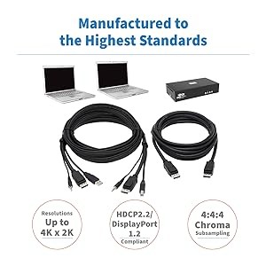 This top-of-the-line cable kit delivers UHD picture quality at resolutions up to 3840 x 2160 (4K x 2K) @ 60 Hz. It supports true 4:4:4 chroma subsampling, reducing data rate and file size, and meets HDCP 2.2, DisplayPort 1.2 and USB 2.0 standards (with speeds up to 480 Mbps).