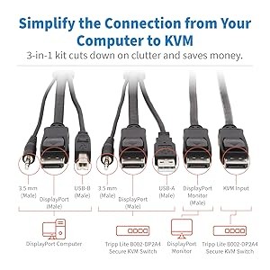 Featuring two 10 ft. cables with DisplayPort, USB and 3.5 mm audio connectors on both ends, Tripp Lite’s P783-010-DP connects your DisplayPort computer and two monitors to a KVM switch without requiring a mess of different cables. Recommended for Tripp Lite’s B002-DP2A4 NIAP KVM switch, this cable kit cuts down on clutter and saves money by eliminating the need to purchase additional cables.