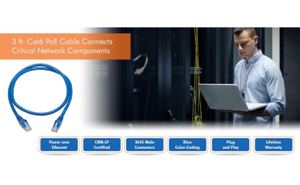 Because this Cat6 cable supports PoE, it can supply the power to operate compatible PoE devices, such as security cameras, VoIP telephones, point-of-sale kiosks and access control devices.