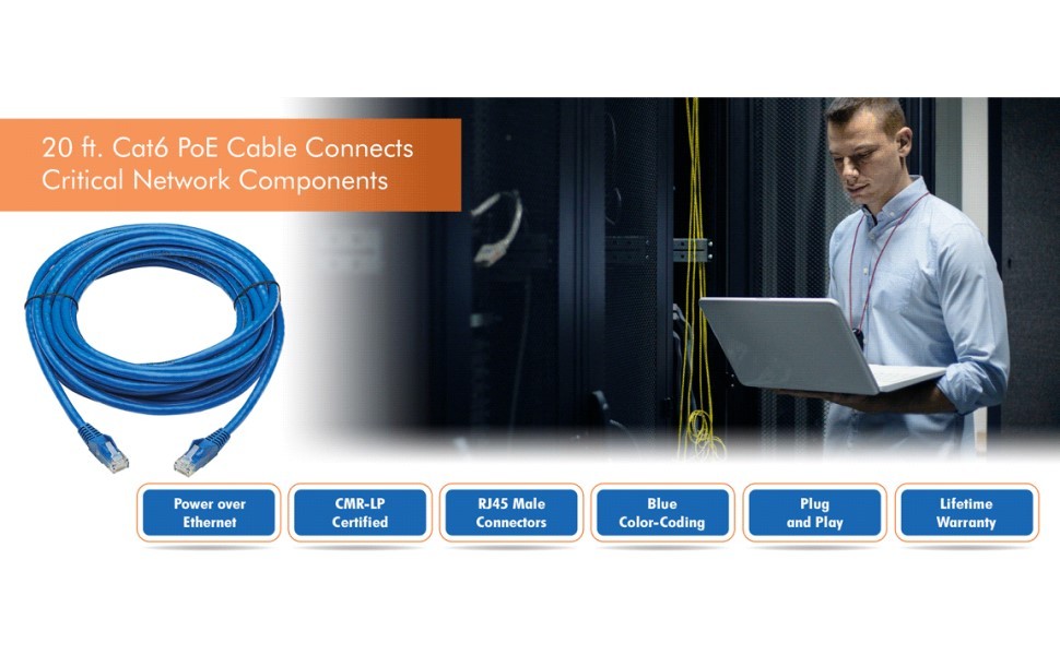 Because this Cat6 cable supports PoE, it can supply the power to operate compatible PoE devices, such as security cameras, VoIP telephones, point-of-sale kiosks and access control devices.