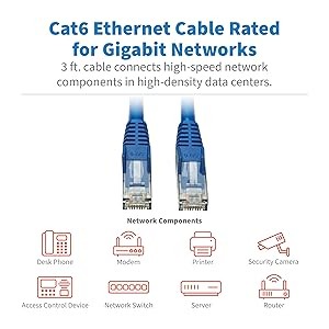 This Tripp Lite Cat6 UTP cable with RJ45 connectors is recommended for connecting network components like printers, adapters, routers, servers, modems, hubs and switches in high-density data centers.