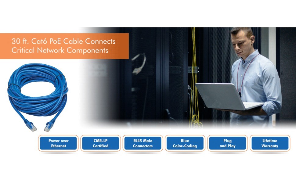 Because this Cat6 cable supports PoE, it can supply the power to operate compatible PoE devices, such as security cameras, VoIP telephones, point-of-sale kiosks and access control devices.
