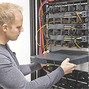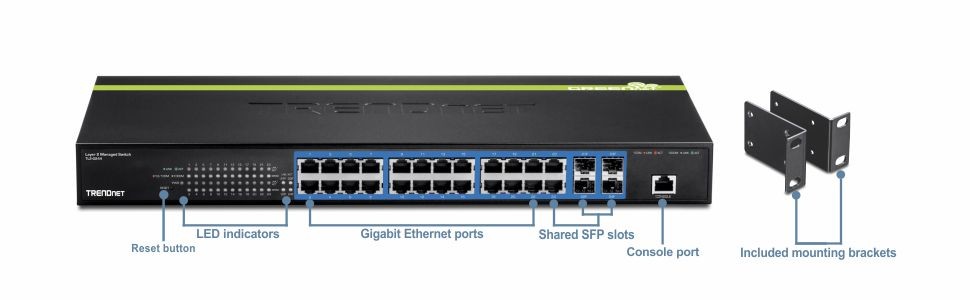 Provides 24 x Gigabit ports, 4 x shared SFP slots, a console port, and includes rackmount brackets