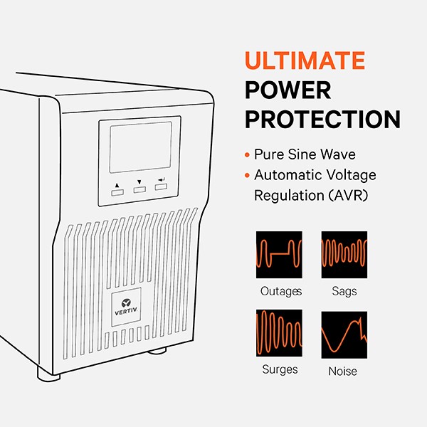 Downtime is costly. Ensure that your critical IT systems are protected from power issues. With advanced pure sine wave output, the Vertiv Liebert PSI5 UPS compensates for power fluctuations, protects against equipment damage, and prevents data loss during a power disturbance. The AVR technology safeguards equipment against a range of utility power fluctuations without battery operation.