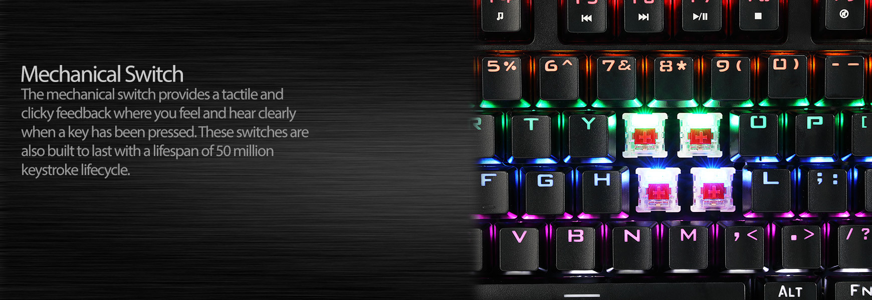 The mechanical switch provides a tactile and clicky feedback where you feel and hear clearly when a key has been pressed. These switches are also built to last with a lifespan of 50 million keystroke lifecycle.