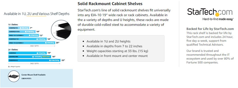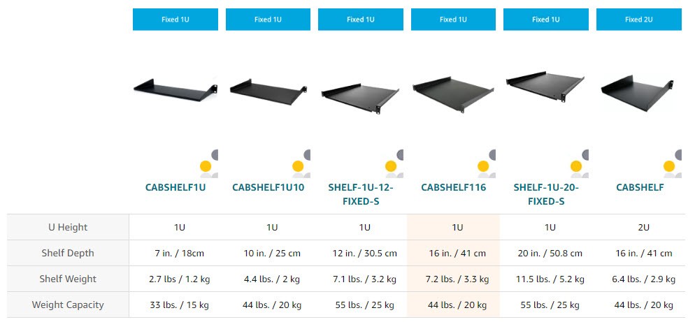 Made from 2mm thick SPCC cold-rolled steel, our family of universal solid rack shelves can be installed in any standard 19” server rack. Offered in a variety of depths from 7 to 22 inches.