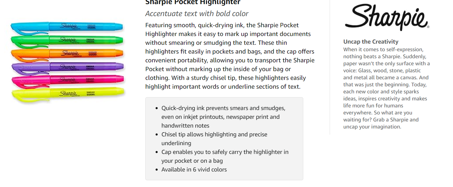 Take your work wherever you go with the convenient, compact Sharpie Pocket Highlighter, which features vibrant ink that won’t smudge important text. A chisel tip produces sharp lines, and the pocket clip attaches to binders and backpacks for easy portability.
