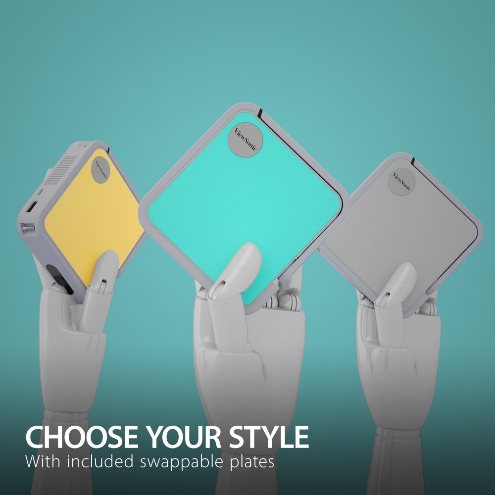 M1 mini is a pocket-sized ultra-portable LED projector that delivers big-screen entertainment in nearly any location. Featuring a built-in battery with power bank compatibility, the M1 mini delivers true portability and hours of entertainment without the need of a power cord. Lightweight and measuring only 4” x 4”, this tiny projector can be placed in your purse, backpack, or back pocket, making it perfect for entertainment on the go. The M1 mini also includes swappable panels in three different colors – gray, yellow, and teal – so you can change the look of the projector to suit your style. An integrated smart stand provides for flexible setup, while also doubling as a lens cover. A built-in JBL speaker provides crisp and clear sound, while a USB reader port lets you play multimedia content from an external dongle. Compact and lightweight, the M1 mini can be enjoyed in the kids’ room or in the backyard, or carry it on the road camping, in hotels, or anywhere your travels take you.