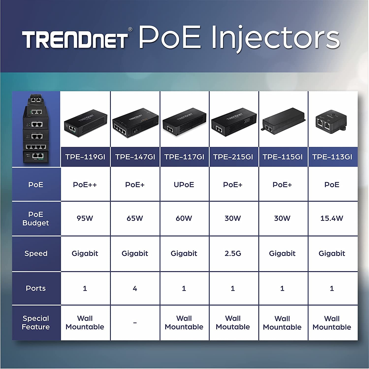 The 2.5G PoE+ injector supplies a PoE device with PoE (15.4W) or PoE+ (30W) power.