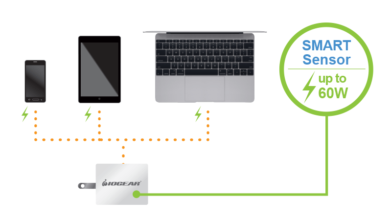 The GaN charger intelligently and automatically senses power needs up to 60W to accommodate the power demands of most USB-C devices on its single port through a USB Type C to USB Type C cable.*