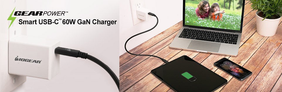 IOGEAR's GearPower™ Smart USB-C 60W GaN Charger accommodates the power demands of USB-C devices such as a laptop or tablet with a charging capacity of up to 60W on its single port. With its compact design, the smart charger will easily find a home on the kitchen counter, nightstand, in the office or on the road with you.