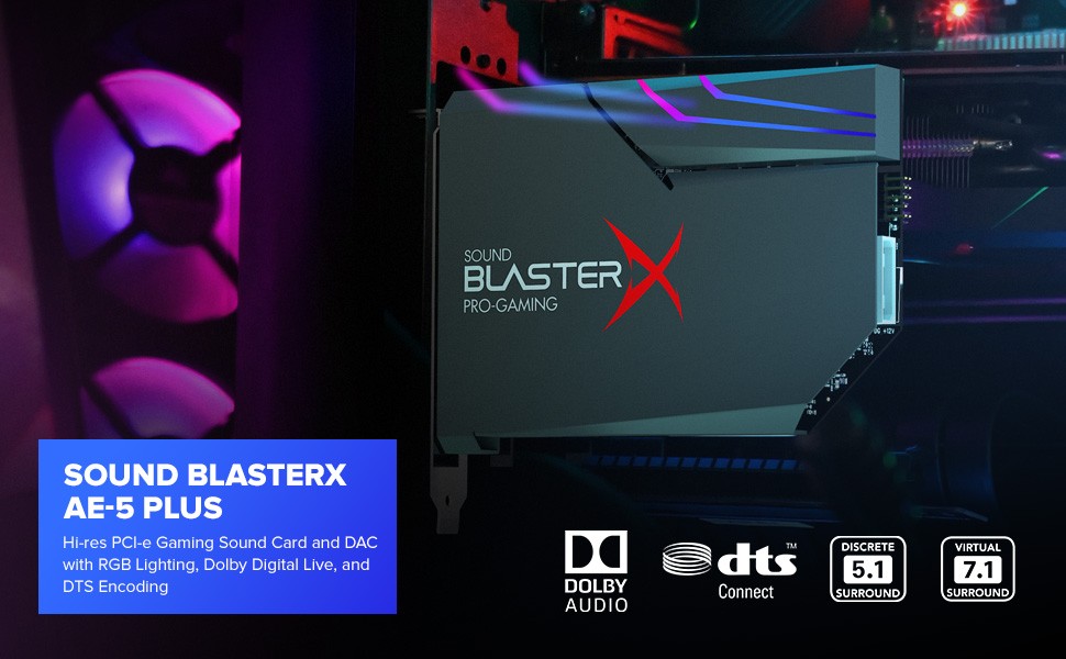Be one of the proud OPs showing off their gaming rigs on r/battlestations! The Sound BlasterX AE-5 Plus is a perfect convergence between aesthetics and performance that features a SABRE32 ultra-class hi-res PCI-e gaming sound card and DAC with customizable RGB LEDs on its body, and comes with an included RGB LED strip. It also features our award-winning Xamp discrete headphone amp that utilizes a bi-amplification technology, as well as our full suite of industry-leading audio processing technologies including Surround Virtualization.
