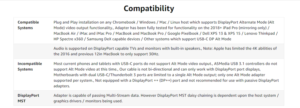 This compact adapter is under 2 inches in size, making it perfect for travel and taking on the go. Featuring a unique flat cable design, you can forget about messy cables and take advantage of the tight bend radius, which allows the adapter to fit in confined and compact spaces. The adapter enables a DisplayPort output at resolutions up to 3840x2160 @ 60Hz (4K 60Hz) from systems which support “DisplayPort Alternate Mode” (Alt Mode) via USB-C.