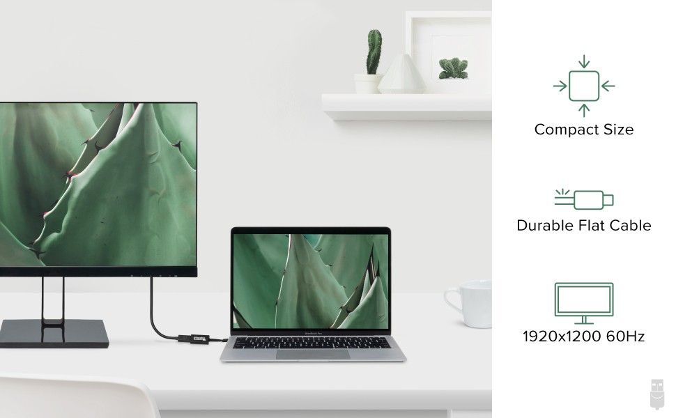 This compact adapter is under 2 inches in size, making it perfect for travel and taking on the go. Featuring a unique flat cable design, you can forget about messy cables and take advantage of the tight bend radius, which allows the adapter to fit in confined and compact spaces. The adapter enables a VGA output at resolutions up to 1920x1200 @ 60Hz from systems which support “DisplayPort Alternate Mode” (Alt Mode) via USB-C.