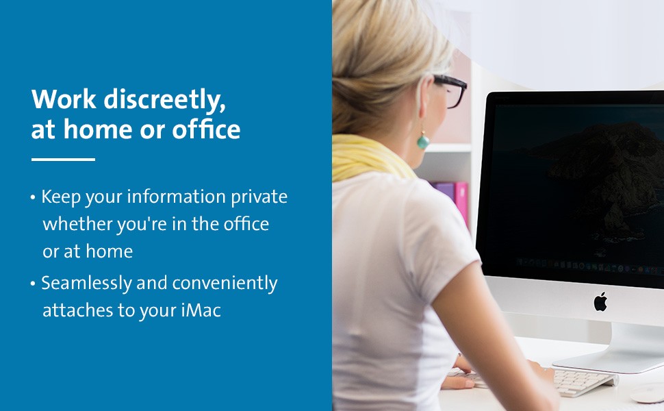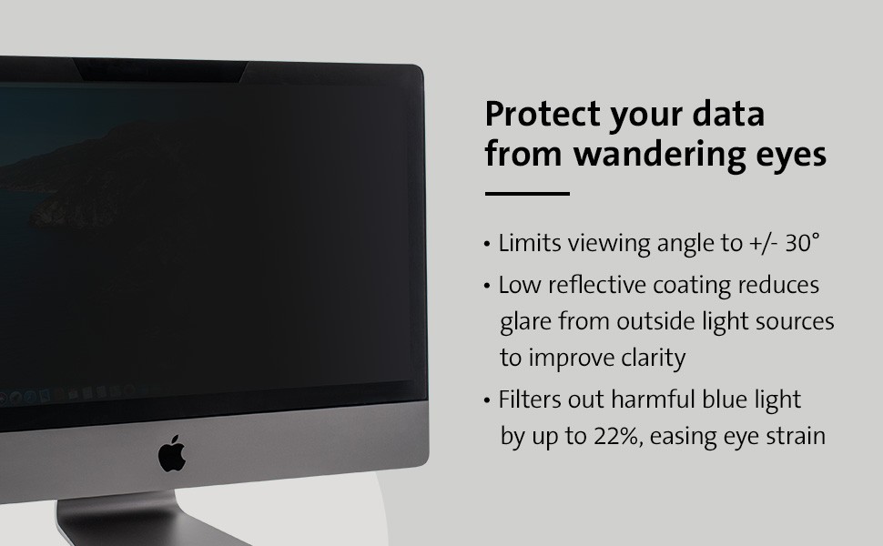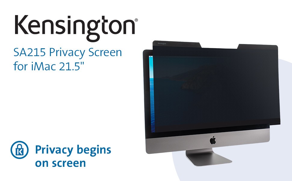 The SA215 Privacy Screen for iMac 21.5” helps protect your privacy, simply and easily. A washable, reusable adhesive makes installation — and re-installation — a breeze, with no unsightly bubbles. Protects privacy by limiting viewing angle to +/- 30°. Reduces harmful blue light by up to 22%, diminishes glare, improves clarity, and protects from scratches and damage. Includes a cleaning cloth.