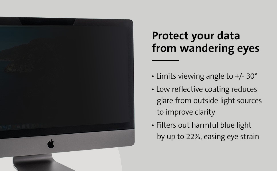 installation — and re-installation — a breeze, with no unsightly bubbles. Protects privacy by limiting viewing angle to +/- 30°. Reduces harmful blue light by up to 22%, diminishes glare, improves clarity, and protects from scratches and damage. Includes anti-bacterial cleaning cloth.