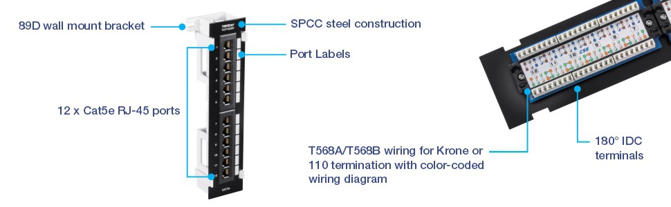 This compact patch panel includes an 89D wall mount bracket for vertical or horizontal installations. The snap-in style wall mount bracket design provides quick and easy access to cable connections when needed for installation or troubleshooting.