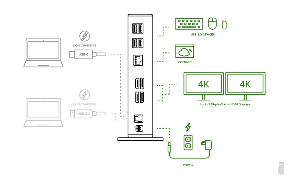 Featuring DisplayLink graphics technology, you can connect this dock to a USB 3.0 or USB-C laptop. So whether you're hoteling at a desk for work, or sharing your dock at home, this dock provides the flexibility you need.