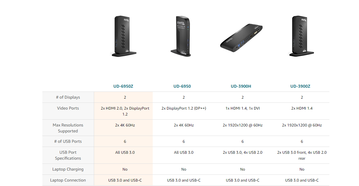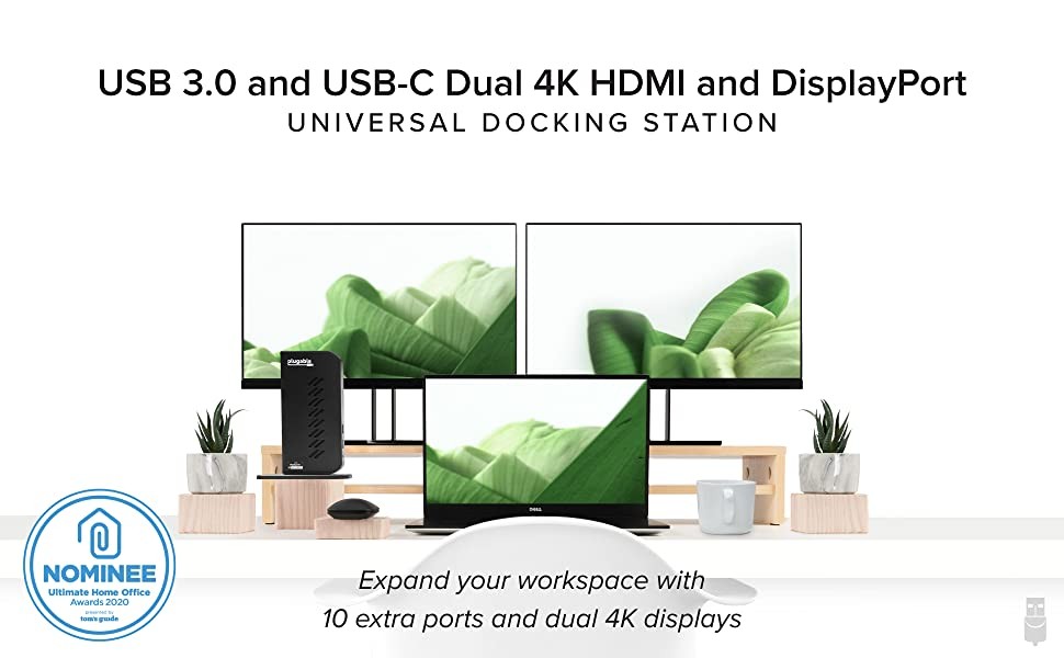 Designed for those who want a one-stop upgrade for your USB 3.0 or USB-C laptop. The Plugable USB 3.0 Dual 4K Docking Station (UD-6950Z) allows you to add dual displays, using DisplayPort or HDMI, and connect your peripherals, all through a single cable back to your laptop. Quickly come and go from your desk with ease. By connecting many devices with just one cable to your laptop, you gain 10 extra ports of connectivity, making it easier to do more work in less time.