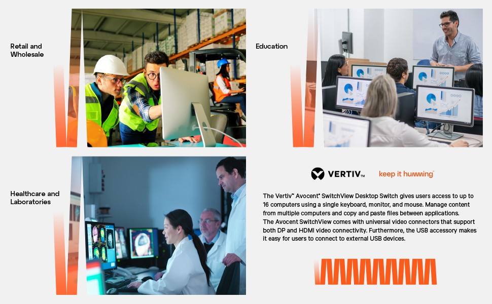 The Vertiv Avocent SwitchView Desktop Switch presents users with the widest array of video connections in the industry, including Display Port, HDMI, and DVI-D connections. Native video support up to UHD 4k @ 60Hz with a flexible screen or window layout option with zero lag.