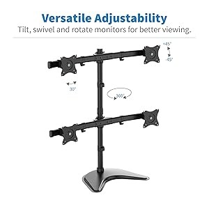 The four monitor mounts feature multiple adjustments, allowing you to reduce glare and find the most comfortable viewing angle. The heavy-duty steel base keeps the stand stable during adjustments.