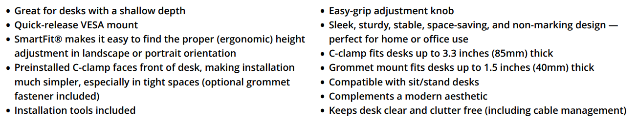 Finding the correct ergonomic monitor adjustment is easy — even for desks with a shallow depth — with the SmartFit® Space-Saving Single Monitor Arm. Easy, nonpermanent installation includes necessary tools and a preinstalled C-clamp that faces the front of the desk, making installation much simpler, especially in tight spaces (optional grommet mount included). An easy-grip adjustment knob allows you to quickly and easily adjust height (9.4”-18.5”), tilt and swivel (+/- 10°), rotate to landscape or portrait orientation (+/-180°), and lock your monitor in place. Sleek, sturdy, stable, space-saving, and non-marking design is perfect for home or office use. C-clamp fits desks up to 3.3 inches (85mm) thick. Grommet mount fits desks up to 1.5 inches (40mm) thick. Compatible with sit/stand desks. Supports monitors up to 32” and up to 17.6 lbs. (8 kg), and complements a modern aesthetic. Includes cable management and a quickrelease VESA mount.