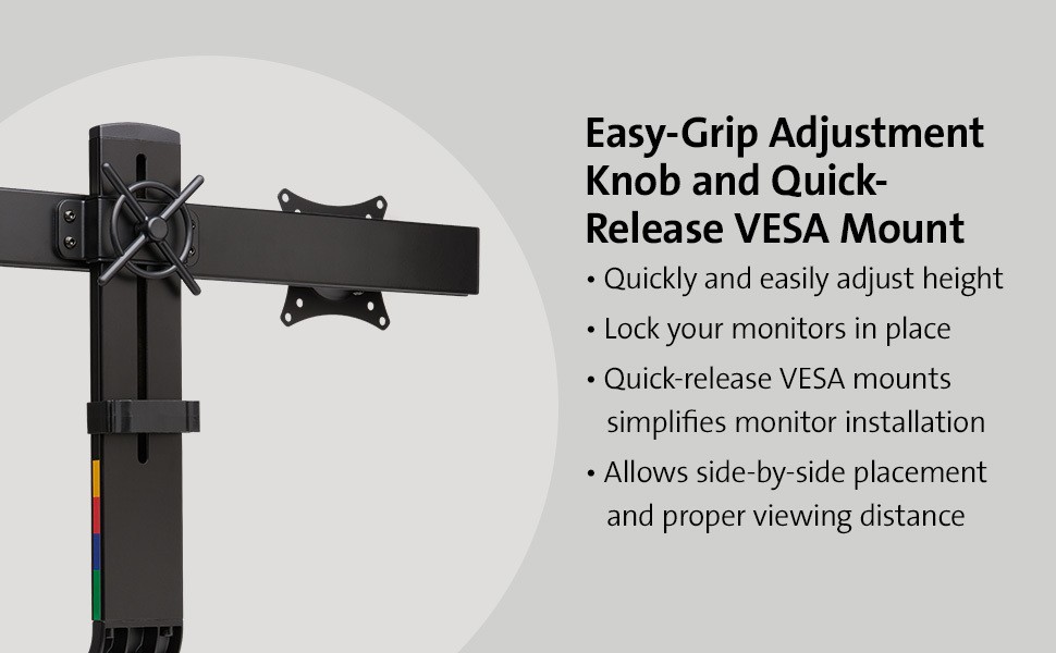 Supports monitors up to 27” and up to 17.6 lbs. (8 kg), and complements a modern aesthetic. Includes cable management and quickrelease VESA mounts.