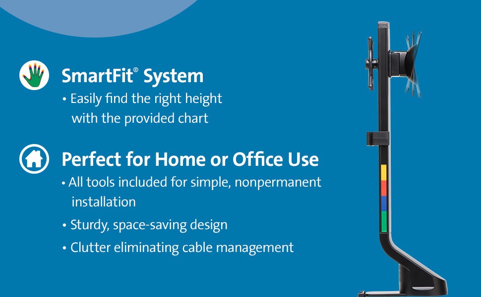 Finding the correct ergonomic monitor adjustment is easy — even for desks with a shallow depth — with the SmartFit® Space-Saving Dual Monitor Arm. Easy, nonpermanent installation includes necessary tools and a preinstalled C-clamp that faces the front of the desk, making installation much simpler, especially in tight spaces (optional grommet mount included). An easy-grip adjustment knob allows you to quickly and easily adjust height (9.4”-18.5”), tilt and swivel (+/- 10°), rotate to landscape or portrait orientation (+/-180°), and lock your monitors in place. Sleek, sturdy, stable, space-saving, and non-marking design is perfect for home or office use. C-clamp fits desks up to 3.3 inches (85mm) thick. Grommet mount fits desks up to 1.5 inches (40mm) thick. Compatible with sit/stand desks.