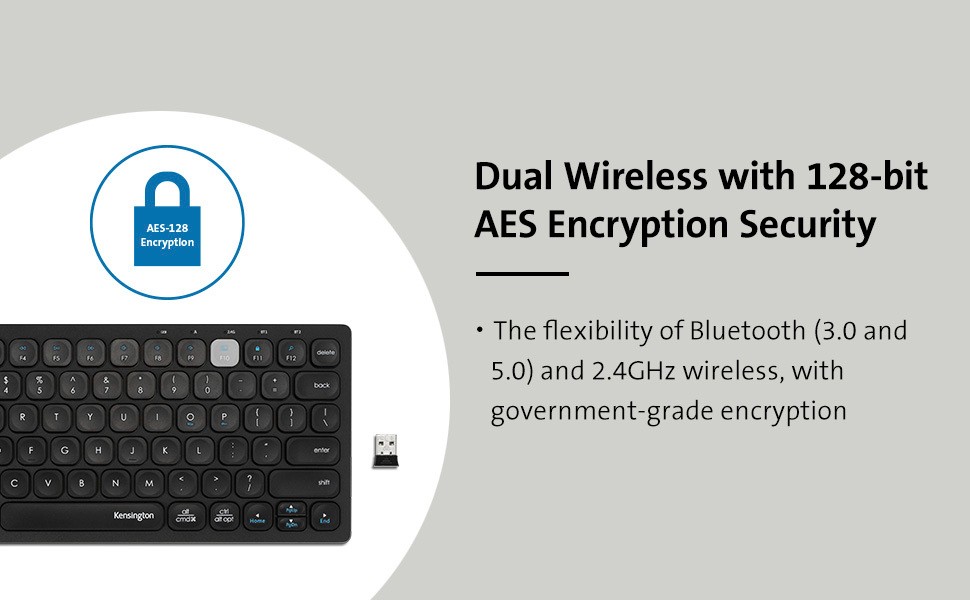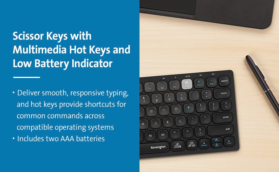The perfect keyboard for flexible workspaces, the Multi-Device Dual Wireless Compact Keyboard lets you connect and switch between up to three devices at a time (computer, tablet, or phone), using Bluetooth (3.0 or 5.0) or 2.4GHz wireless with 128-bit AES encryption. Smooth, responsive scissor keys include multimedia hot keys. Windows, macOS, iOS, and Chrome OS compatible. Low battery indicator, so you’re never caught off guard. Includes two AAA batteries.