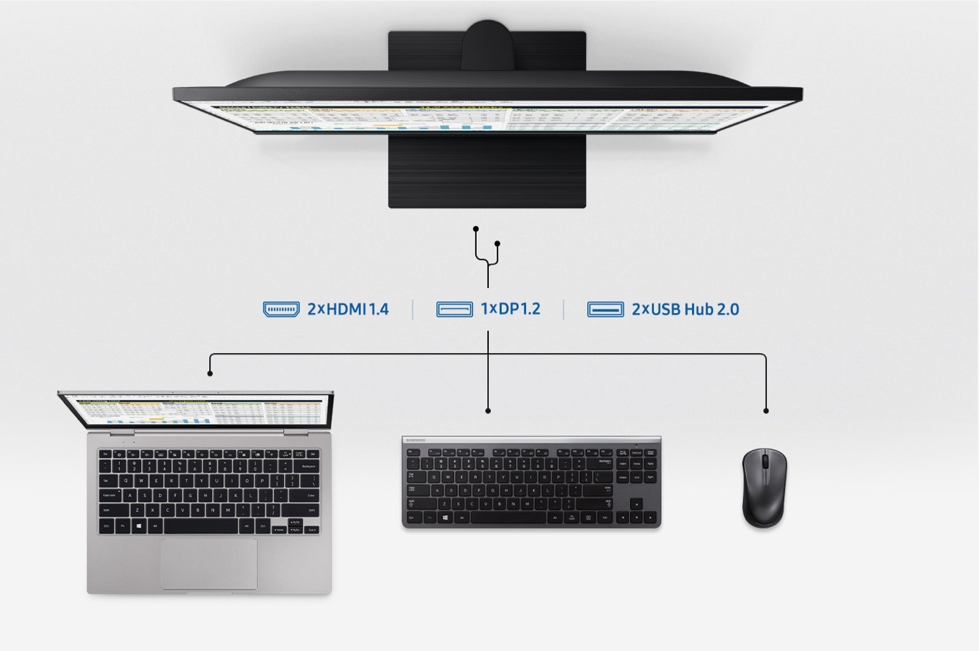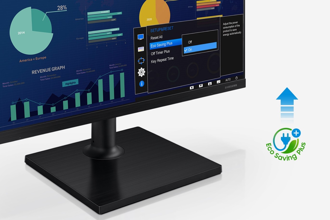 The Samsung FT45 Series provides ergonomic features that enhance both all-day comfort and productivity. A fully adjustable stand puts the impressive picture right where you need it, and Eye Saver mode and Flicker Free technology help to relieve eye strain and fatigue. Versatile connectivity simplifies things, with HDMI, DisplayPort and a USB hub. Energy-saving features help to reduce power consumption by up to 10% for a cost-effective desktop monitor solution.