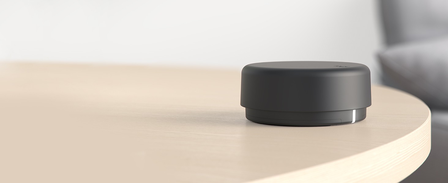Press and spin it to play, pause, control volume, and bass, from 20 m/65 ft away