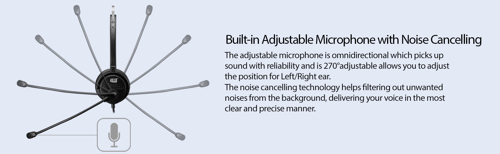The adjustable microphone is omnidirectional which picks up sound with reliability and is 270° flexible allows you to adjust the position for Left/Right ear. The noise cancelling technology helps filtering out unwanted noises from the background, delivering your voice in the most clear and precise manner.