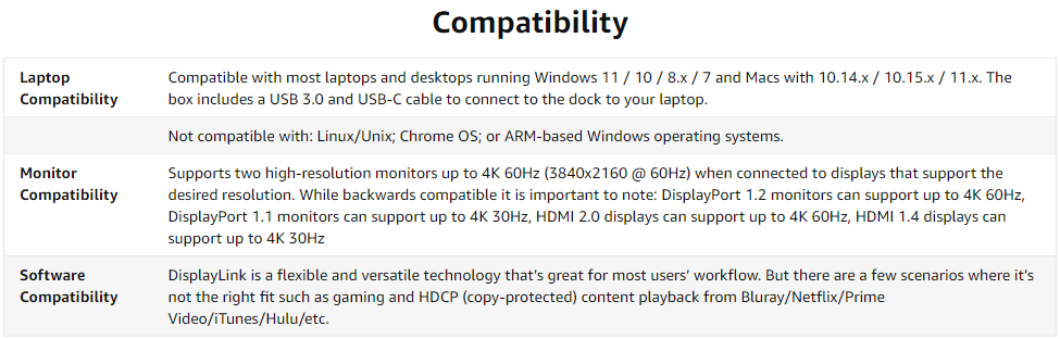 UHD ImageConnect your HDMI or DP equipped monitor, television, or projector to your laptop and achieve resolutions up to 3840x2160 @ 60Hz (4K 60Hz). Other popular supported resolutions include 3440x1440, 2560x1440, 1920x1200, 1920x1080, and lower. |