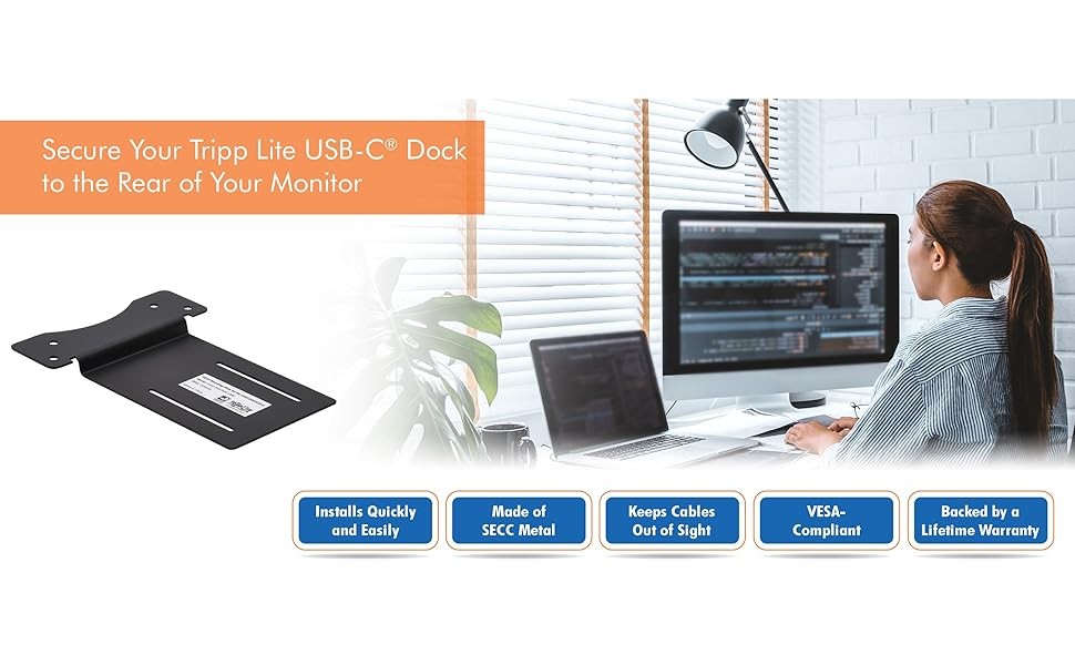 This durable, SECC-engineered mounting plate attaches the U442-DOCK20-B docking station to the rear of your monitor, providing extra workspace and minimizing clutter. It’s easy to install with included hardware, and its sturdy metal frame stands up to the stress of everyday use.
