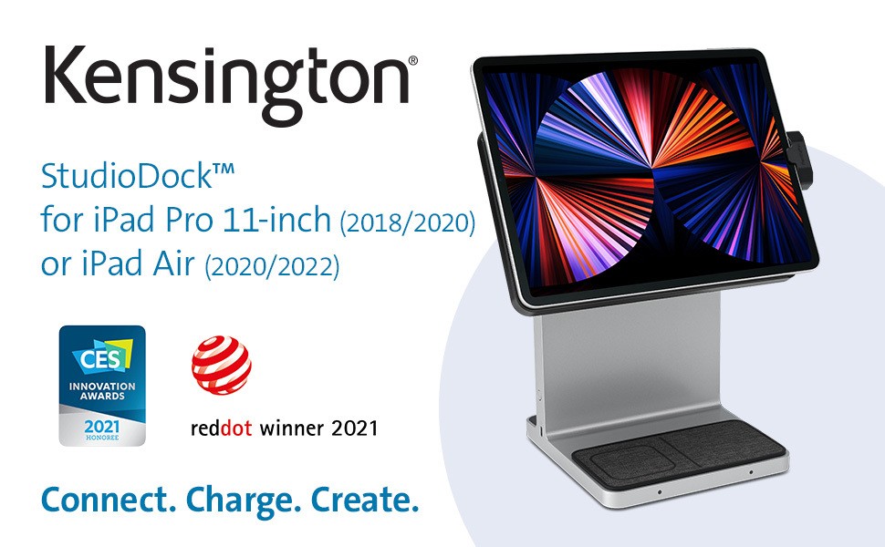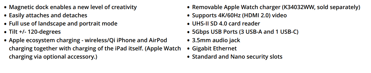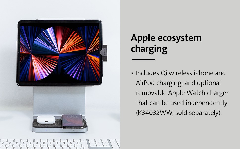 Get the most from your iPad Pro or iPad Air (2020/2022) with StudioDock. The ideal iPad docking station that expands more than your desktop options — it expands your creativity. Magnetically attach and detach your USB-C iPad Pro 11” (2018/2020) or iPad Air (2020/2022) to the elegantly designed StudioDock, and the possibilities are endless. Apple ecosystem charging includes Qi wireless iPhone and AirPod charging, as well as optional charging for Apple Watch (K34032WW, sold separately) and the iPad itself. Seamless access to expansion ports, including USB (USB-A and USB-C), HDMI 2.0 video, Gigabit Ethernet, 3.5mm audio, and SD card reader.