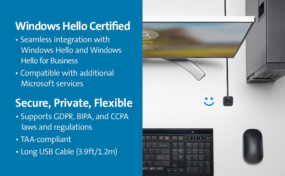 VeriMark™ Desktop Fingerprint Key With support for the latest in biometric technology, the VeriMark™ Desktop Fingerprint Key puts business-class desktop security at your fingertips. Ideal for enterprise PC deployment, the VeriMark™ Desktop Fingerprint Key is FIDO U2F Certified, and FIDO2 WebAuthn compatible. Windows Hello certified (includes Windows Hello for Business) for seamless integration. Also compatible with additional Microsoft services including Office365, Azure, Outlook, and many more. It’s a secure, reliable, and simple solution for singlefactor (passwordless), dual, multi-factor, and Tap-and-Go1 for FIDO U2F services, offering web-based (WebAuthn) support across major browsers. Encrypted end-to-end security with Match-in-Sensor™ Fingerprint Technology exceeds industry standards for false acceptance rate (FAR) and false rejection rate (FRR). Includes a long (3.9 ft./1.2m) USB cable for flexible placement. Supports GDPR compliance and is TAA-compliant.