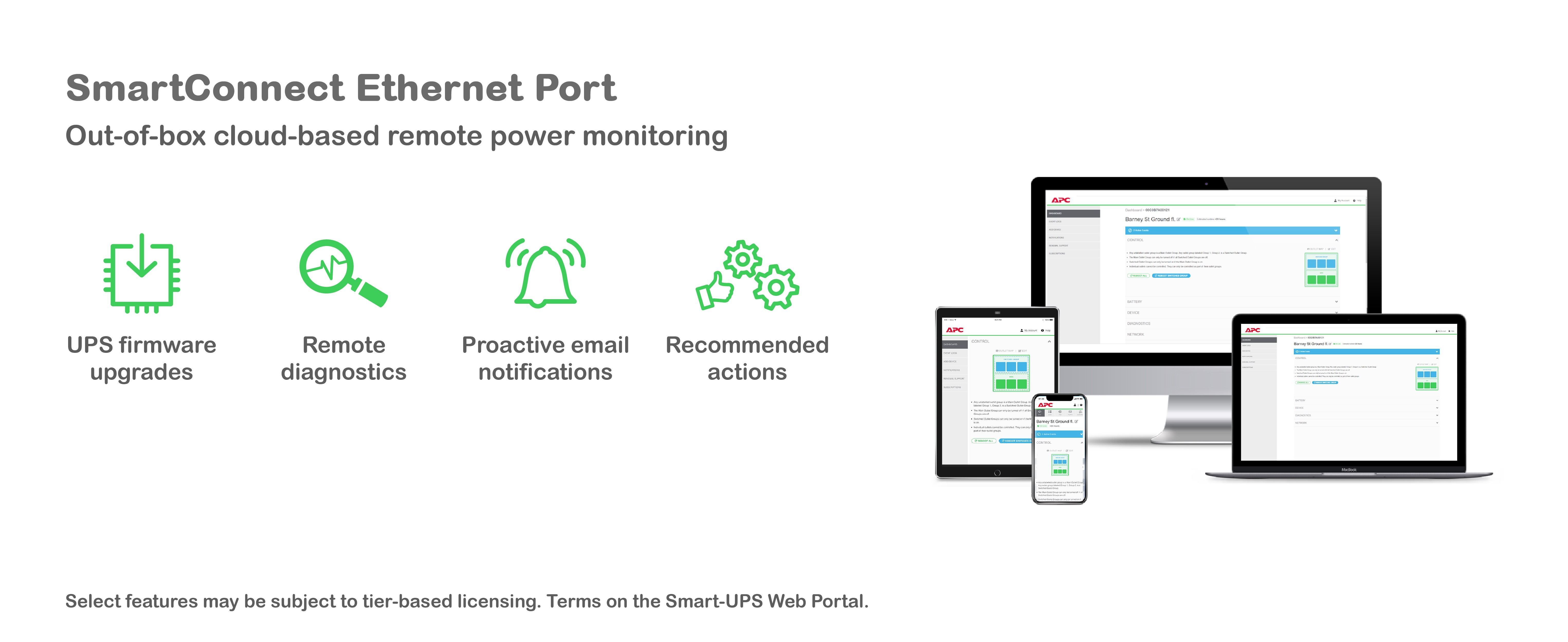 All new devices are on-boarded to the Standard plan with remote power monitoring, UPS and power events, automated distribution of firmware to UPSs with one-click remote installation and downloadable asset and renewal reports. Advanced Plan option provides UPS Outlet Group reboot for remote power cycling of connected IT equipment. Features vary with terms of use.