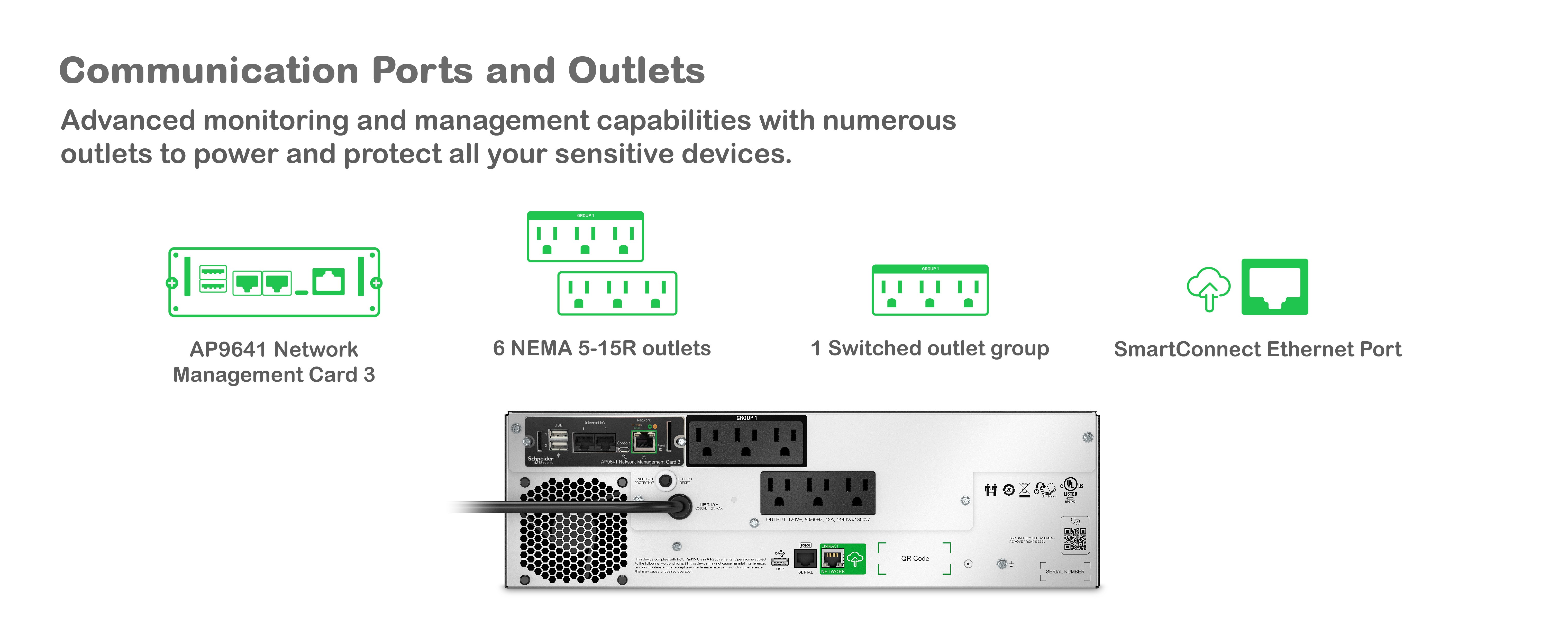 3) Pre-installed Network Management Card - Enables network-based monitoring and management of UPS with a preinstalled AP9641 network card 3.