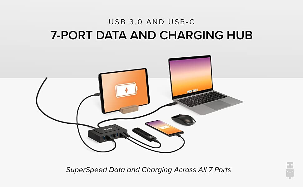 The Plugable USB 3.0 and USB-C 7-Port Hub delivers performance in a way that few others can match. Connected to a laptop–USB-A and USB-C connections included–you have instant access to 7 USB ports, each capable of transfer speeds up to 5Gbps. And here’s something unique, you also get maximum USB charging speeds on every single port.