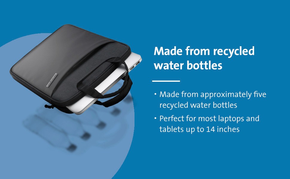 Made from recycled water bottles, the 14” Eco-Friendly Laptop Sleeve carrying case not only helps protect laptops and tablets from scratches, bumps,