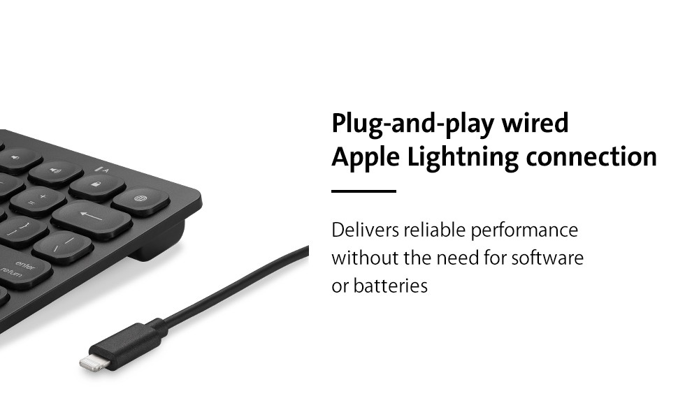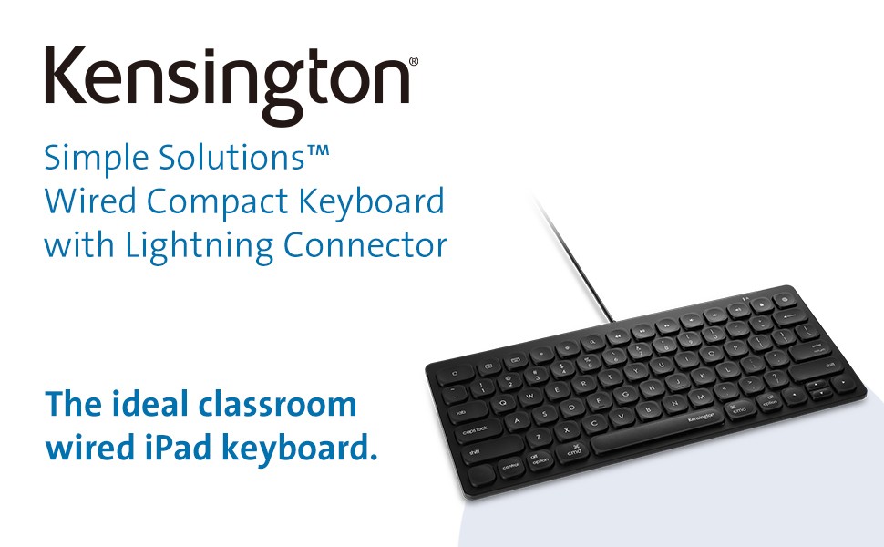 The Simple Solutions™ Wired Compact Keyboard with Lightning Connector is the ideal classroom plug-and-play iPad keyboard. Features include fullsize, responsive scissor keys for a comfortable and precise typing experience; 14 shortcut keys to quickly navigate common iOS keyboard commands; durable, lightweight, compact design; and a caps lock LED indicator. Wired Apple Lightning connection delivers reliable performance without the need for batteries or charging; MFi certied to work with Apple iPads and iPhones with a Lightning Connector.
