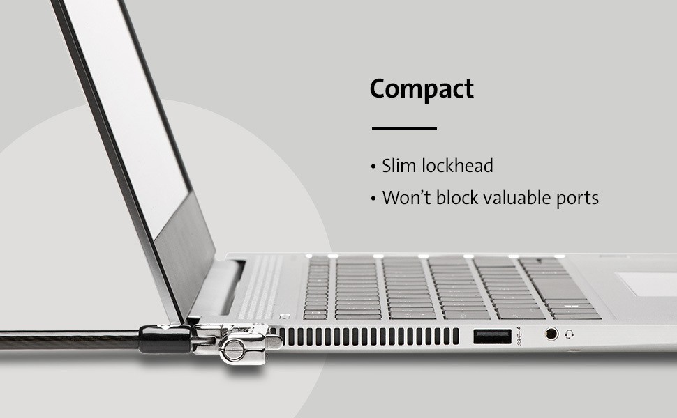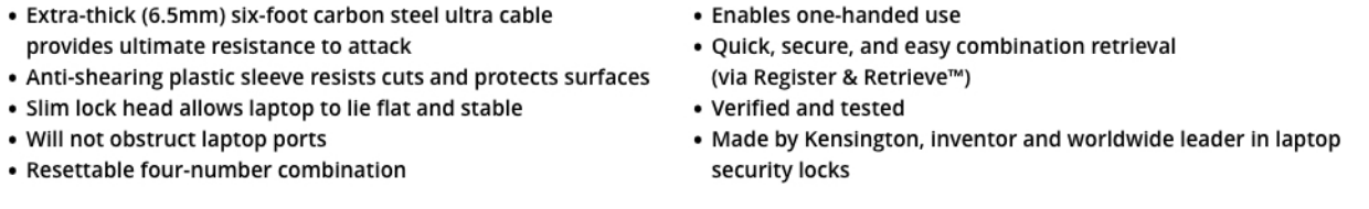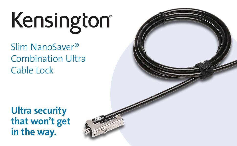 Ideal for thin laptops with a nano slot, the Slim NanoSaver® Combination Ultra Cable Lock offers our highest level of protection against cutting attempts, while allowing the laptop to lie flat and stable, and without blocking valuable ports. Extra-thick (6.5mm) six-foot carbon steel cable is sheathed in an anti-shearing plastic sleeve that resists cuts and protects surfaces. Features include a resettable four-number combination; one-handed operation; and Register & Retrieve™ for quick, secure, and easy combination retrieval. Meets or exceeds rigorous strength testing standards. From Kensington, inventor of the laptop cable lock, and industry leader in physical device security for more than 25 years.