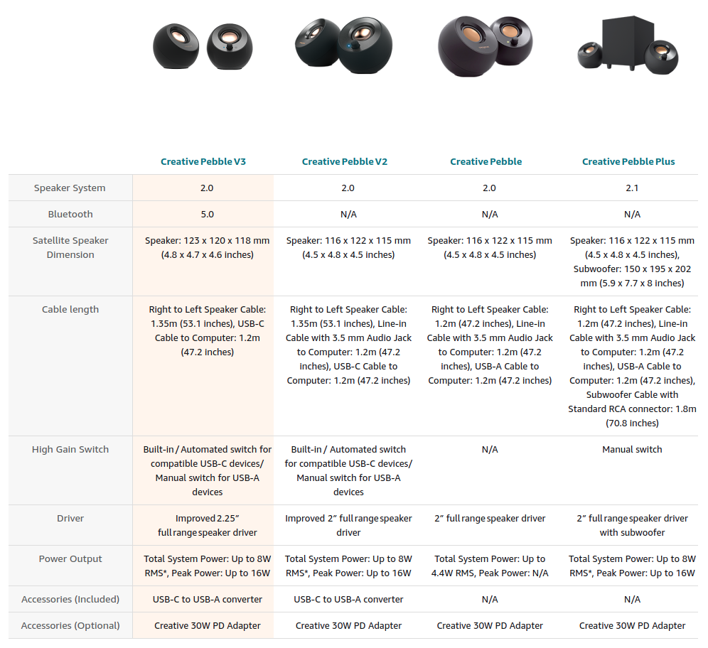 *Creative Pebble V3 has to be powered via USB while in Bluetooth or AUX-in mode.