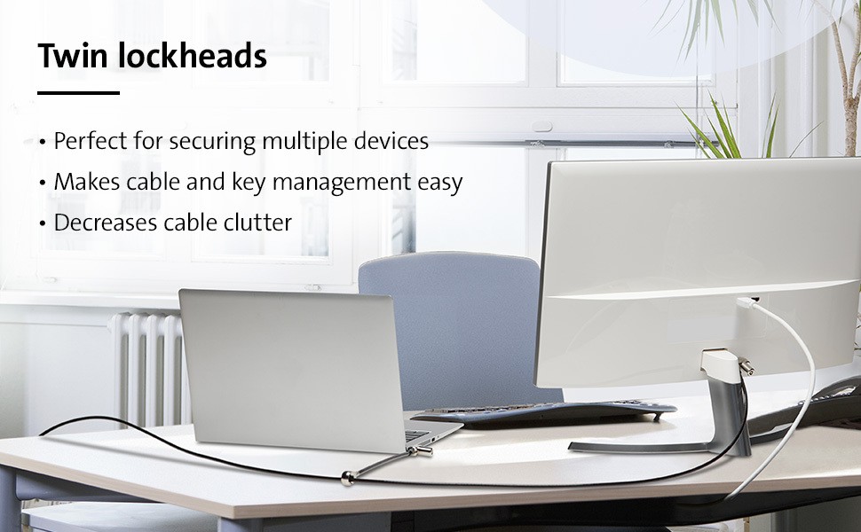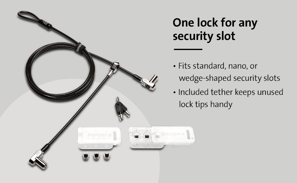 The Universal 3-in-1 Keyed Cable Lock - Twin Lockheads fits standard, nano, and wedge-shaped security slots, ensuring a universal fit regardless of hardware brand or generation. Perfect for securing multiple devices such as a laptop, monitor, or docking station, making cable and key management easier, decreasing cable clutter, and helping to “future-proof” your locking solution. Lock tips are easily changed; a tether keeps unused lock tips handy. Common 5mm keying system, patented Hidden Pin™ technology, and carbon steel cable provide strong security against picking and theft attempts. Pivot and rotate lock head allows flexible movement and easy key insertion. Additional features include Register & Retrieve™ for quick, secure, and easy key replacement. All Kensington locks are verified and tested for strength, physical endurance, and mechanical resilience.
