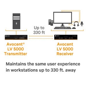 The Vertiv Avocent LV5000 KVM extender enables the placement of critical computing hardware in a secure and climate-controlled environment, while maintaining the same user experience in workstations up to 330 ft. away. The additional Local Pass Through feature of the LV5500 is allows the Local console output to duplicate incoming video and audio. This declutters workspaces and better secures computing assets housing your critical data.
