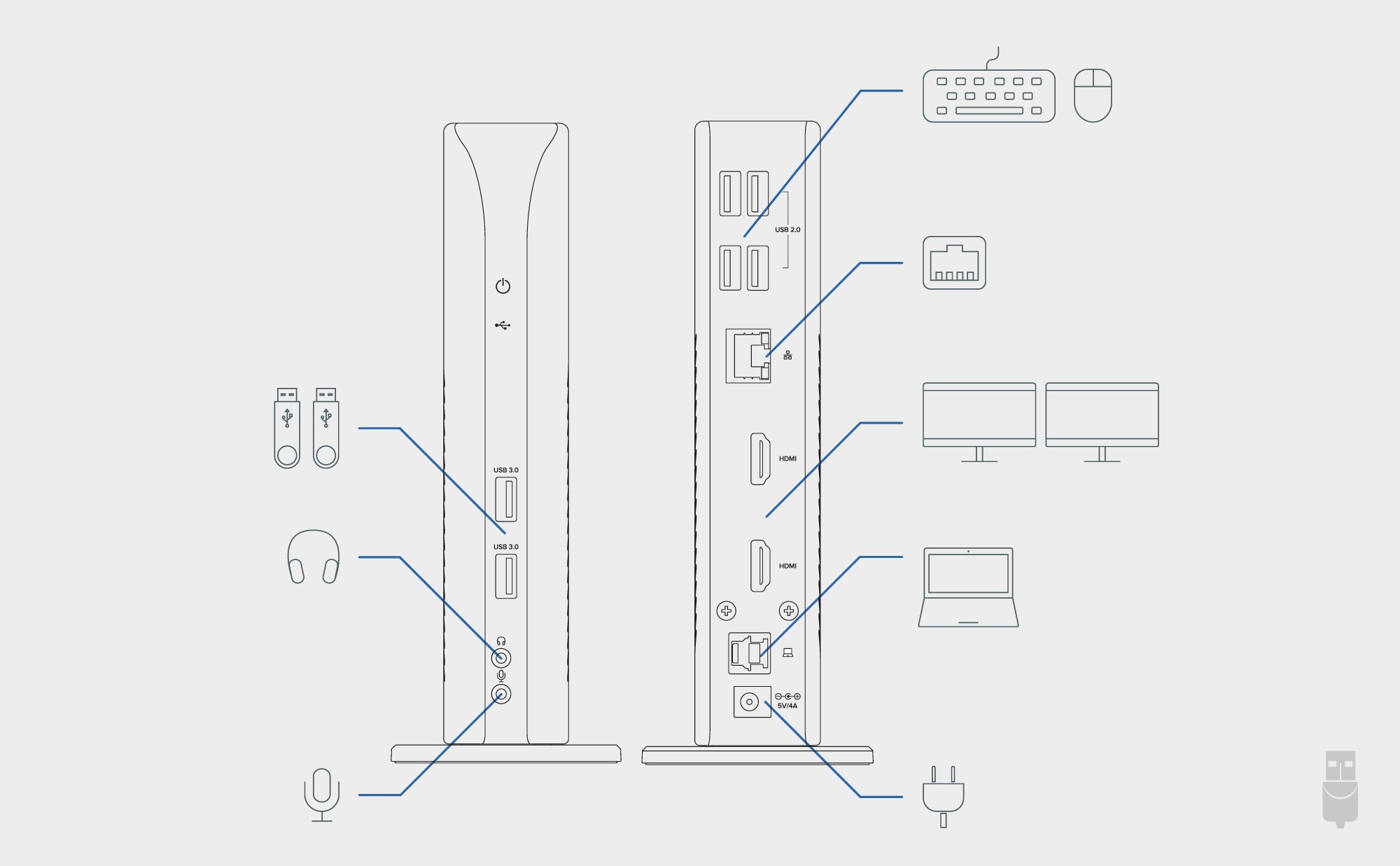 Featuring 2x HDMI ports, 2x USB 3.0 ports, 4x USB 2.0 ports, a Gigabit Ethernet port for wired network connectivity, an audio input/output jack, and a truly intuitive one plug connection, the Plugable UD-3900C is the ultimate docking station for the hybrid office, the home office, or anywhere work gets done.